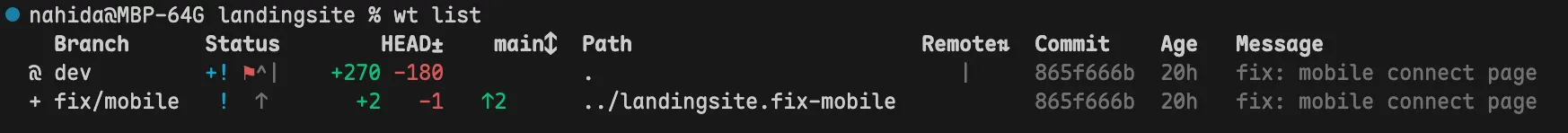 | 列出所有 worktree 状态 | wt list | git worktree list (只显示路径) |