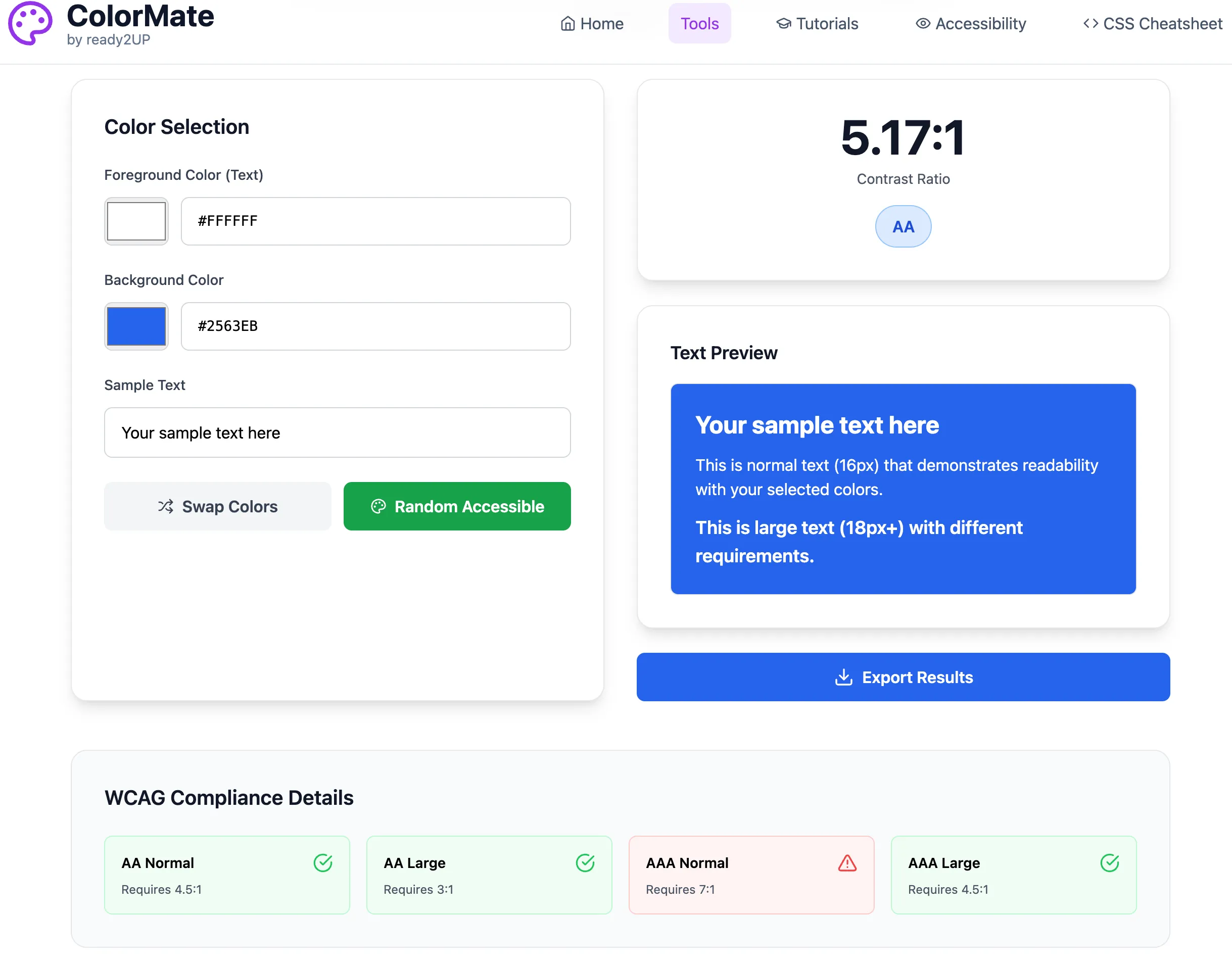 - ColorMate:又一款面向设计师与开发者的免费在线配色工具,可快速生成符合无障碍标准的调色板。用户可提取图片配色、即时预览 UI 效果、进行对比度测试,并将结果以 HEX、CSS 或 PNG 格式导出。它还提供由 AI 命名、锁定颜色及实时生成新方案的功能,并收录多种热门配色示例。