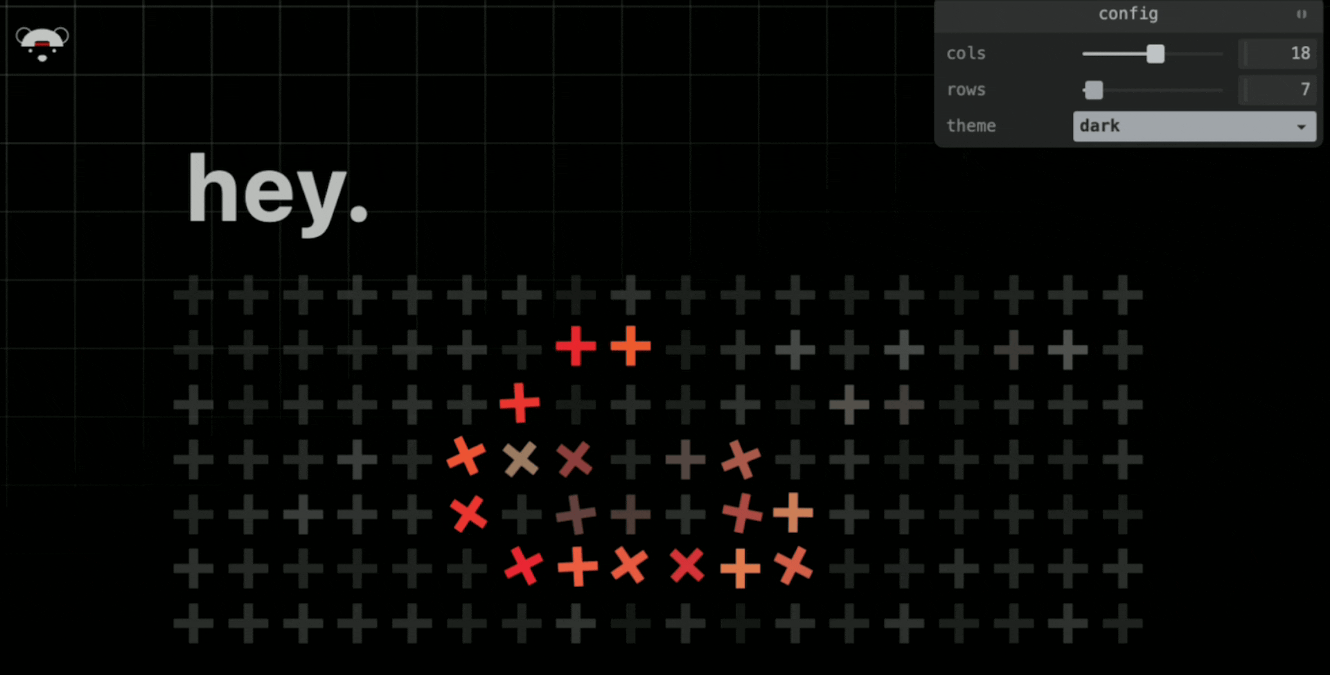 在 Jhey Tompkins 设计的这款可配置 Pen 中,将鼠标悬停在加号网格上,即可观看它们变换颜色和旋转。您还可以通过顶部的控制面板调整网格大小和主题颜色。